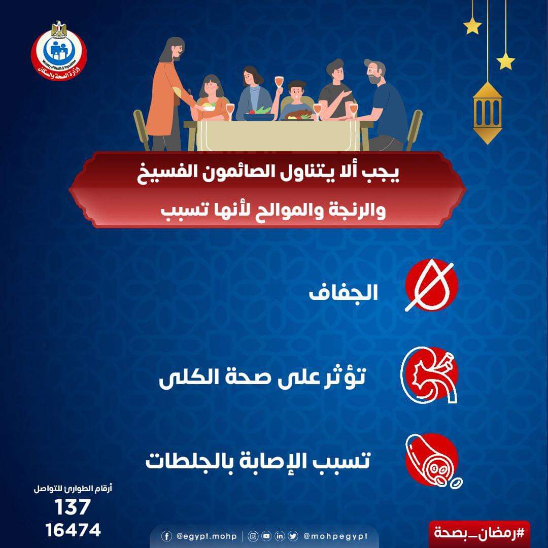 حذرت وزارة الصحة من تناول الصائمين الفسيخ والرنجة والموالح لأنها تصيبهم بالجفاف وتؤثر على صحة الكلى.