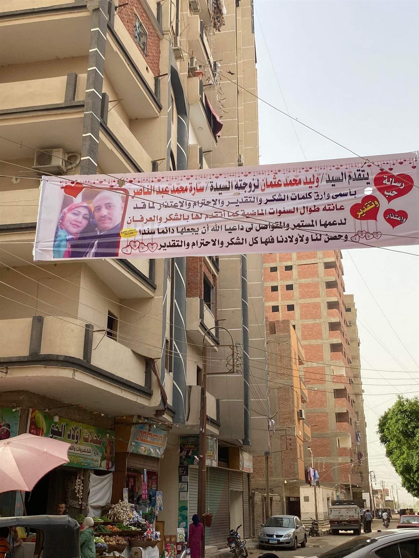 لافتة وليد وسارة تثير الجدل في المنيا.. النساء يطالبن الرجال بالاقتداء به.. وزوجته: عودني على المفاجآت الحلوة دي | فيديو