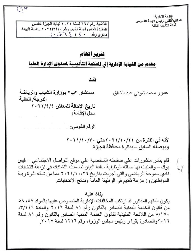 كشفت التحقيقات أن عمرو محمد شوقي، مستشار "ب" بوزارة الشباب والرياضة بالدرجة العالية "وكيل وزارة"، بوصفه الوظيفي وبدائرة محافظة الجيزة قام بنشر منشورات على صفحته الشخصية عبر موقع التواصل الإجتماعي "فيس بوك" الثابت بها صفته الوظيفية تضمنت التشكيك في نزاهة إنتحابات نادي سموحة الرياضي التي أجريت بتاريخ 29 اكتوبر 2021 مما من شأنه إثارة ريبة المواطنين وزعزعة ثقتهم في الوظيفة العامة ونتائج الإنتخابات