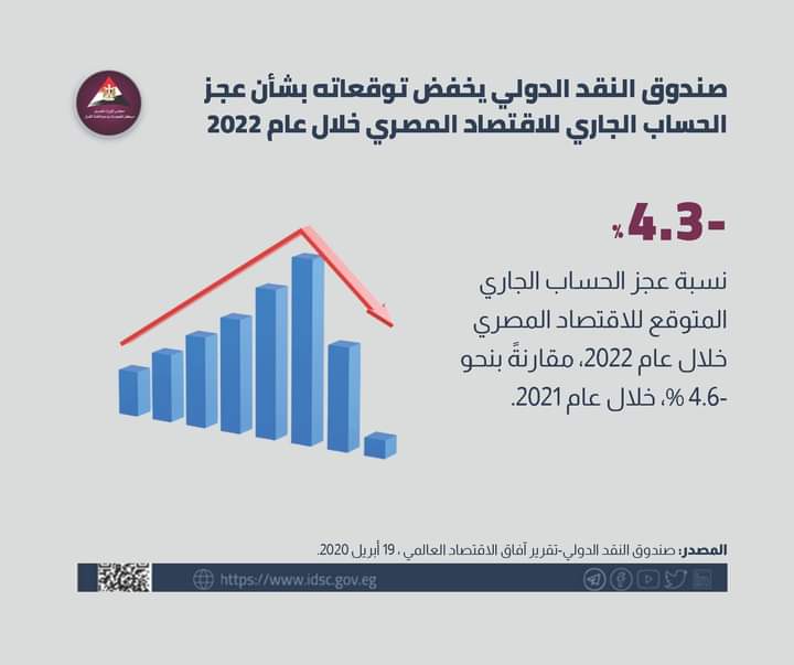 وخفَّض صندوق النقد الدولي في تقريره الصادر بعنوان "آفاق الاقتصاد العالمي- الحرب تُبطئ وتيرة التعافي" في 19 أبريل 2022، من توقعاته بشأن عجز الحساب الجاري المتوقع للاقتصاد المصري، خلال عام 2022، إلى نحو -4.3%، خلال عام 2022، مقارنةً بنحو -4.6 خلال عام 2021.