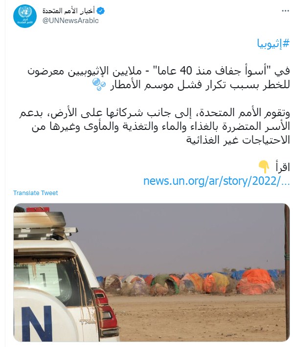 وكتبت الأمم المتحدة تغريدة عبر تويتر "#إثيوبيا.. في "أسوأ جفاف منذ 40 عاما"- ملايين الإثيوبيين معرضون للخطر بسبب تكرار فشل موسم الأمطار.. وتقوم الأمم المتحدة، إلى جانب شركائها على الأرض، بدعم الأسر المتضررة بالغذاء والماء والتغذية والمأوى وغيرها من الاحتياجات غير الغذائية"