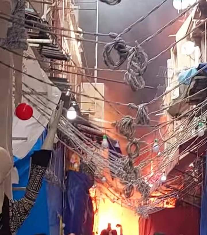 بدء الحريق صباح اليوم، في أحد محال البلاستيك بسبب ماس كهربائي، وسرعا مما امتد إلى أكثر من ١١ محل ومخزنين وعقارين، بسبب وجود مواد قابلة الاشتعال بشكل سريع وعدم وجود وسائل أمان او حماية مدنية وحريق، كما أدى صغر عرض الشارع الذي نشب فيه الحريق والشوارع المجاورة إلى تأخر عمليات الإطفاء لعدم تمكن ١٥ سيارة من سيارات الإطفاء من الدخول بشكل سريع إلى مناطق الحريق الأولية.