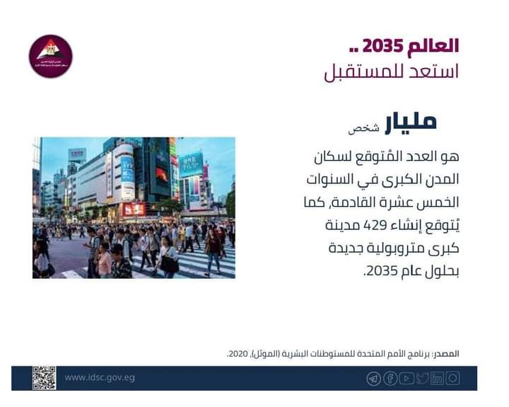 نشر مركز المعلومات ودعم اتخاذ القرار بمجلس الوزراء عبر صفحته الرسمية على موقع التواصل الاجتماعي فيسبوك، إنفوجراف، بشأن العدد المتوقع لسكان المدن الكبرى في السنوات الـ 15 القادمة.