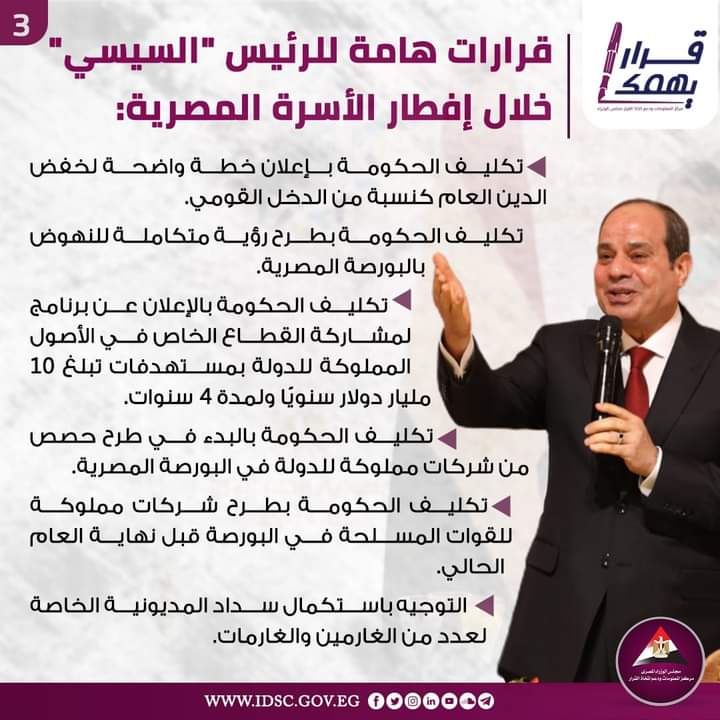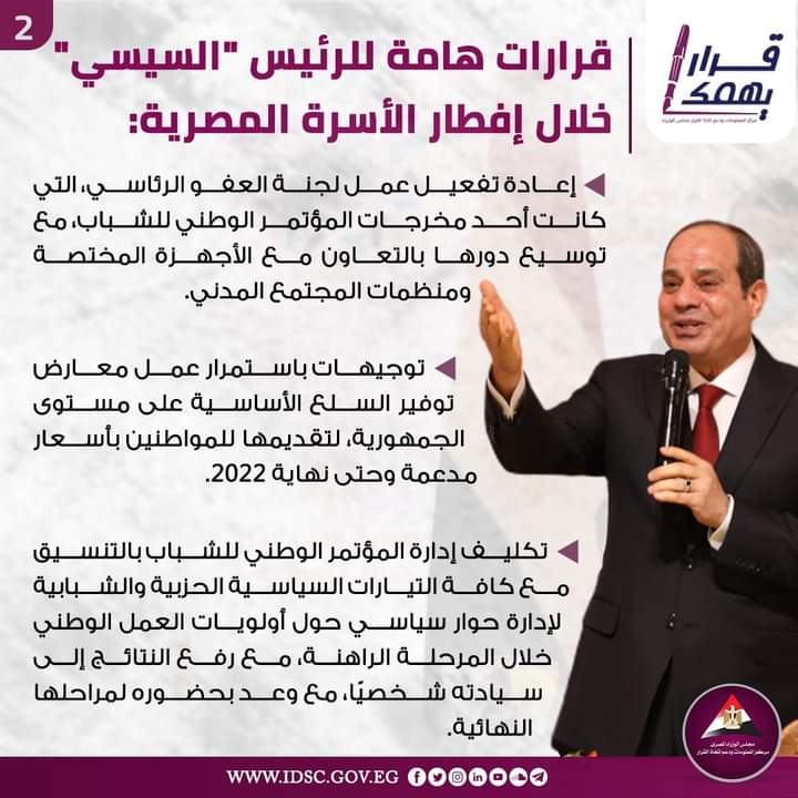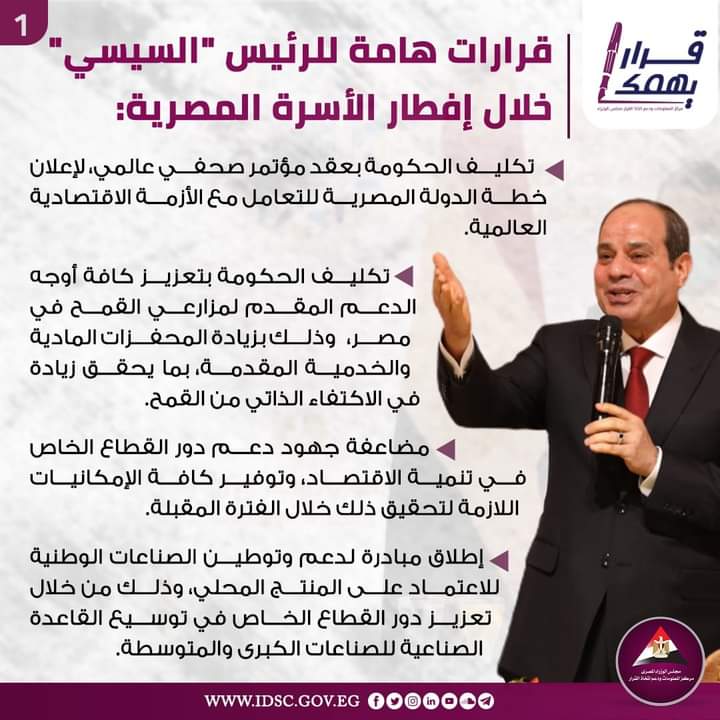 نشر مركز المعلومات ودعم اتخاذ القرار بمجلس الوزراء عبر صفحته الرسمية على موقع التواصل الاجتماعي فيسبوك، إنفوجراف، بشأن قرارات الرئيس عبد الفتاح السيسي خلال حفل افكار الأسرة المصرية.