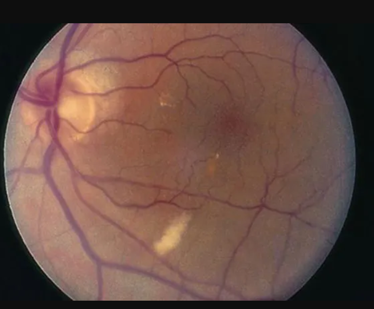 وتُعرف هذه البقع باسم بقع الصوف القطني، وهي علامات على معاناة شبكية ثانوية لانسداد الشريان الصغير، وويمكن أن تكون ناجمة عن انسداد أو التهاب في الأوعية الشبكية، حيث يؤدي التهاب الأوعية الدموية إلى إعاقة الدورة الدموية وربما نقص الأكسجين.