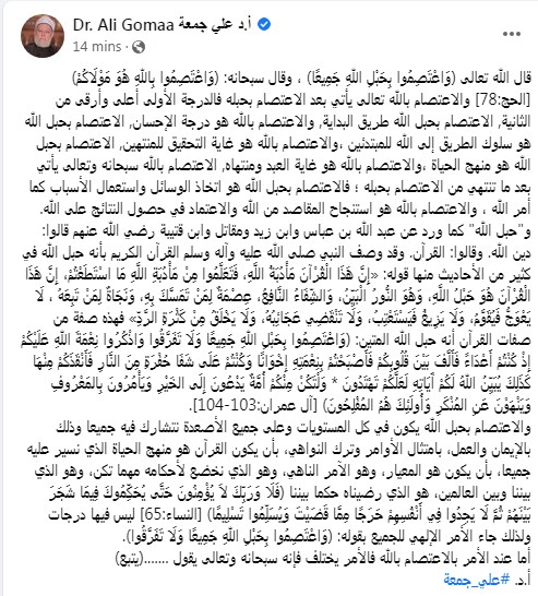 وكتب د. علي جمعة تدوينة على الفيس بوك قائلًا:"قال الله تعالى (وَاعْتَصِمُوا بِحَبْلِ اللهِ جَمِيعًا)، وقال سبحانه: (وَاعْتَصِمُوا بِاللهِ هُوَ مَوْلَاكُمْ) [الحج:78] والاعتصام بالله تعالى يأتي بعد الاعتصام بحبله فالدرجة الأولى أعلى وأرقى من الثانية، الاعتصام بحبل الله طريق البداية، والاعتصام بالله هو درجة الإحسان"