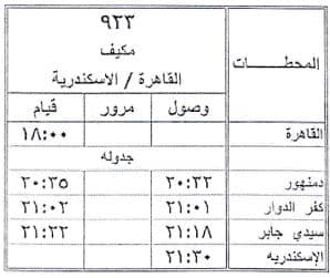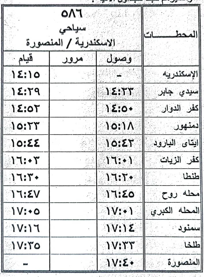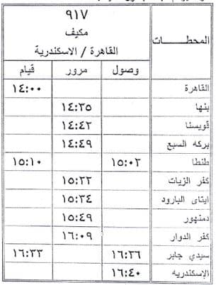أعلنت الهيئة القومية لسكك حديد مصر أنه اعتبارا من يوم 2/5/2022 سيتم إيقاف قطارات ( 917، 904، 927 ) القاهرة / الإسكندرية والعكس vip بمحطة طنطا كتجربة لمدة شهر وتعديل ميعاد (923) القاهرة / الإسكندرية طبقا للجداول المرفقة.