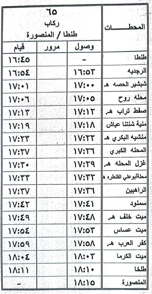 كما أعلنت الهيئة أنه اعتبارا من 9/5/2022 سيتم تعديل ميعاد قطاري (586) سياحي الإسكندرية / المنصورة و(65) ركاب طنطا / المنصورة وفقا للجداول المرفقة.
