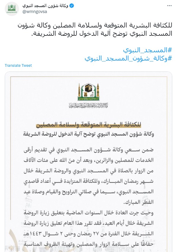وكتبت وكالة شئون المسجد النبوي تغريدة على تويتر "للكثافة البشرية المتوقعة ولسلامة المصلين وكالة شؤون المسجد النبوي توضح آلية الدخول للروضة الشريفة."