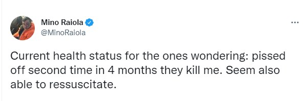 وقال مينو رايولا تغريدة على تويتر "وضعي الصحي الحالي لمن يتساءلون عنها، هو أنني غاضب. يقتلوني للمرة الثانية في 4 أشهر، يبدو أنني قادر على العودة من الموت".