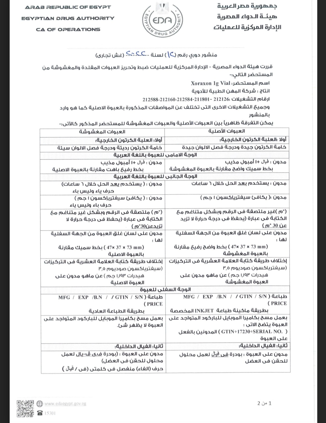 أصدرت هيئة الدواء المصرية منشور رقم 12 لسنة 2022 بشأن وجود عبوات مقلدة و مغشوشة من دواء زواركسون حقن Xoraxon 1gm Vial ويعتبر دواء زوراكسون مضاد حيوي ضد البكتيريا وعلاج الالتهابات.