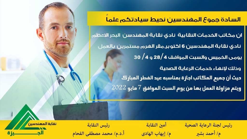 أعلنت نقابة المهندسين فرع الجيزة أن مكاتب الخدمات النقابية نادي نقابة المهندسين البحر الأعظم و6 أكتوبر مقر الهرم مستمرين بالعمل يومي الخميس والسبت الموافق 28-4 و30-4 وذلك لإنهاء خدمات الرعاية الصحية.