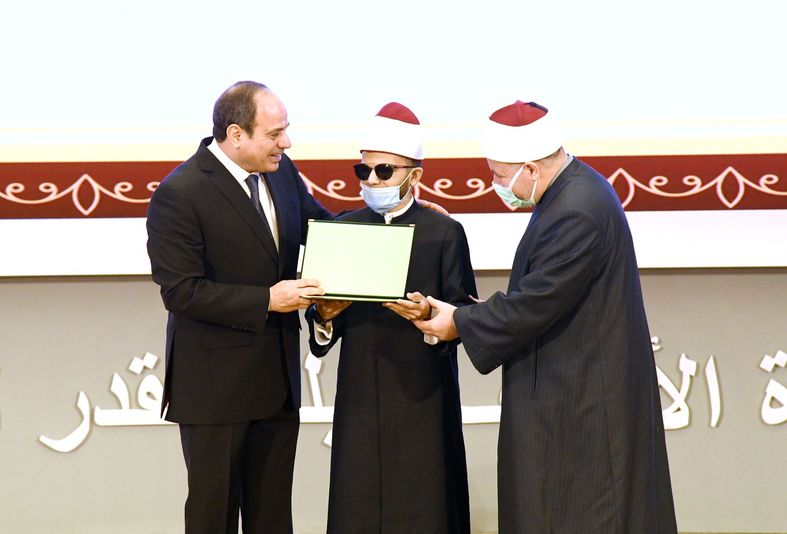 كما كرم الرئيس السيسي، الفائزين فى المسابقة العالمية لحفظة القرآن الكريم، وذلك ضمن فعاليات احتفال وزارة الأوقاف بمناسبة ليلة القدر، الذي حضره الرئيس