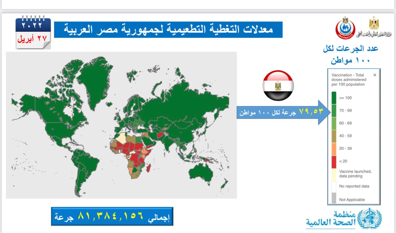 اعلن الدكتور خالد عبدالغفار، وزير التعليم العالي والبحث العلمي والقائم بأعمال وزير الصحة والسكان، ان معدل التطعيم ضد فيروس كورونا فى مصر وصل الى ٧٩.٥٣ جرعة لكل ١٠٠ مواطن وهو مايعد من المعدلات المرتفعة للتطعيمات طبقًا لتصنيف منظمة الصحة العالمية حيث تم صرف ٨١.٣٨٤.١٥٦ جرعة للمواطنين والمقيمين على أرض مصر، ياتى ذلك فى إطار الأسبوع العالمي للتمنيع فى الفترة من ٢٤-٣٠ ابريل ٢٠٢٢.