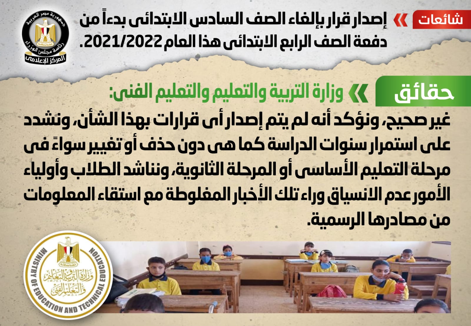رصد المركز الإعلامي بمجلس الوزراء تداول أنباء بشأن إصدار قرار بإلغاء الصف السادس الابتدائي بدءًا من دفعة الصف الرابع الابتدائي هذا العام 2021/2022.