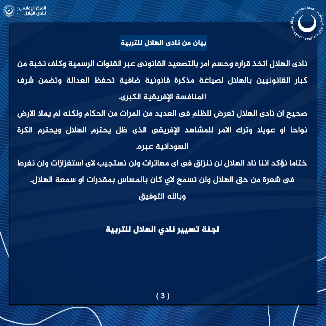 نادي الهلال اتخذ قراره وحسم أمر بالتصعيد القانوني عبر القنوات الرسمية وكلف نخبة من كبار القانونيين بالهلال لصياغة مذكرة قانونية تحفظ العدالة وتضمن شرف المنافسة الإفريقية الكبرى.