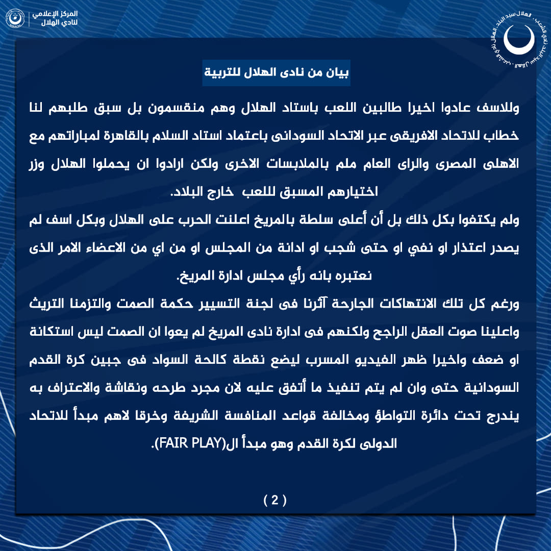 وجاء نص بيان الهلال: هدفت لجنة التسيير إلى إصدار هذا البيان للتوضح للرأى العام الرياضي، ما يدور في الساحة الرياضية والوسائط المختلفة من تداعيات وملابسات ألقت بظلالها على الوسط الرياضي فقد ظل الهلال وعبر تاريخه الناصع يمد أياديه بيضاء للجميع من أجل المصلحة العليا لكرة القدم السودانية وتقدم أنديتها على المستويين الداخلي والخارجي والتزاما بهذه المبادئ فتحنا أبواب استاد الهلال في الموسم الماضى لكل الأندية التي تمثل السودان بلا استثناء بما فيهم المريخ وتكفلنا بكل المنصرفات اللازمة لتهيئة الاستاد فنيا وإداريا وهذا ليس من باب المن والأذى ولكن من أجل توضيح وتبيان الحقائق للتاريخ ومن أجل تنوير الرأي العام دون الالتفات لما يصدر من بعض كتاب نادي المريخ وإداريه الذين قابلوا هذا التعاون بالتبخيس والسعي بل المطالبة بعدم إجازة استاد الهلال من الكاف لاستضافة المباريات الإفريقية، وقابلنا كل ذلك برصيد الحكمة المتوارث عبر تاريخ الهلال ولم نتعامل بردود الأفعال.