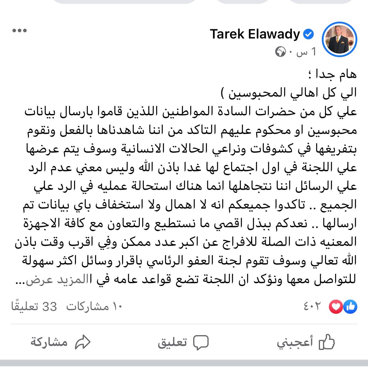 وجه المحامي طارق العوضي، عضو لجنة العفو الرئاسي، نداء إلى كل أهالي المحبوسين الذين أرسلوا بيانات محبوسين أو محكوم عليهم إليه .