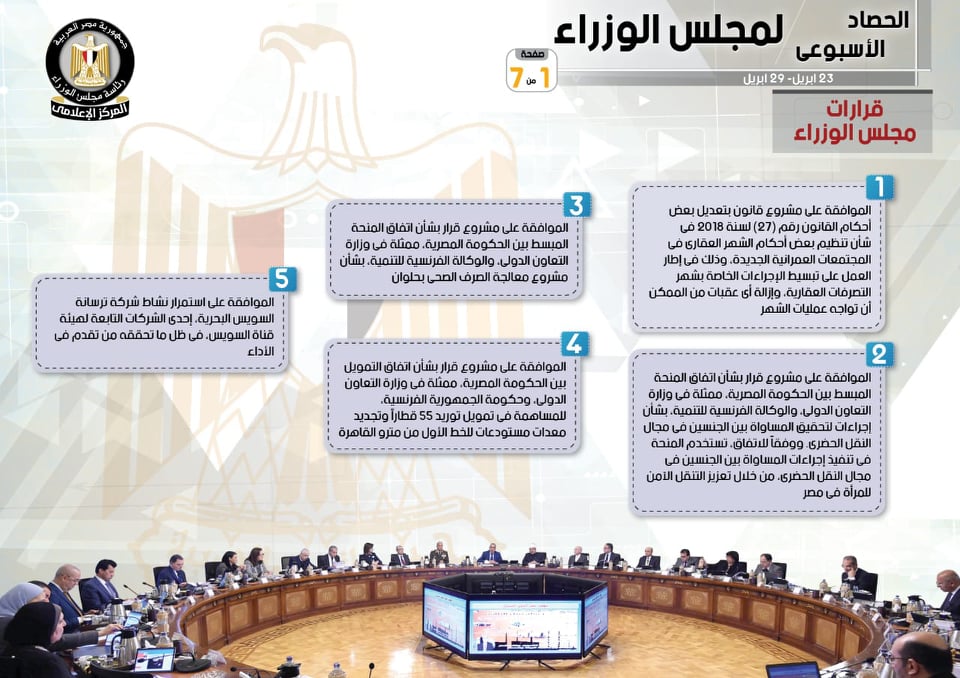 وجاء في التقرير أنه تم إصدار عدد من القرارات، تشمل قرارًا بالموافقة على مشروع قانون بتعديل بعض أحكام القانون رقم (27) لسنة 2018 في شأن تنظيم بعض أحكام الشهر العقاري في المجتمعات العمرانية الجديدة، وذلك في إطار العمل على تبسيط الإجراءات الخاصة بشهر التصرفات العقارية، وإزالة أي عقبات من الممكن أن تواجه عمليات الشهر، بالإضافة إلى الموافقة على مشروع قرار بشأن اتفاق المنحة المبسط بين الحكومة المصرية، ممثلة في وزارة التعاون الدولي، والوكالة الفرنسية للتنمية، بشأن إجراءات لتحقيق المساواة بين الجنسين في مجال النقل الحضري.