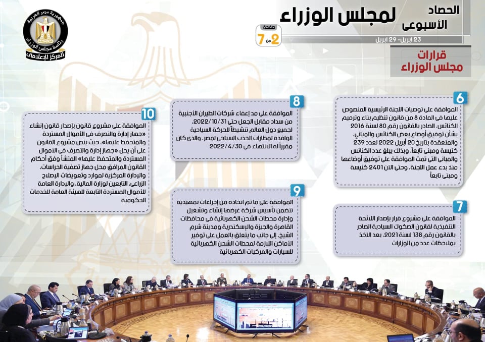 كما تضمنت القرارات أيضًا، الموافقة على مشروع قرار بشأن اتفاق التمويل بين الحكومة المصرية، ممثلة في وزارة التعاون الدولي، وحكومة الجمهورية الفرنسية، للمساهمة في تمويل توريد 55 قطارًا وتجديد معدات مستودعات للخط الأول من مترو القاهرة، بجانب الموافقة على استمرار نشاط شركة ترسانة السويس البحرية، إحدى الشركات التابعة لهيئة قناة السويس، في ظل ما تحققه من تقدم في الأداء، وكذلك الموافقة على توصيات اللجنة الرئيسية المنصوص عليها في المادة 8 من قانون تنظيم بناء وترميم الكنائس، الصادر بالقانون رقم 80 لسنة 2016 بشأن توفيق أوضاع بعض الكنائس والمباني، والمنعقدة بتاريخ 20 أبريل 2022 لعدد 239 كنيسة ومبنى تابعًا، وبذلك يبلغ عدد الكنائس والمباني التي تمت الموافقة على توفيق أوضاعها منذ بدء عمل اللجنة، وحتى الآن 2401 كنيسة ومبنى تابعًا.