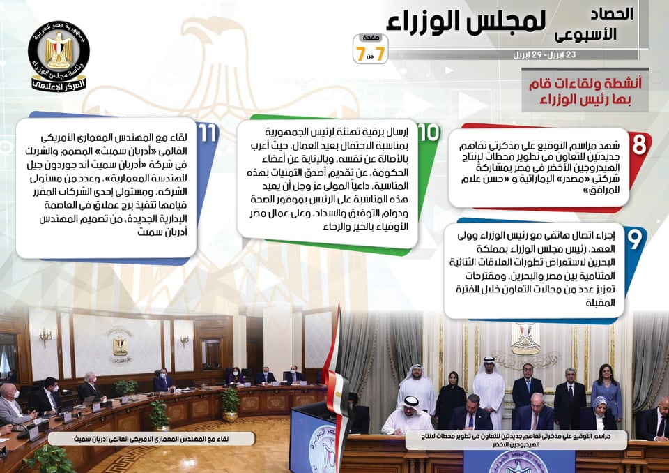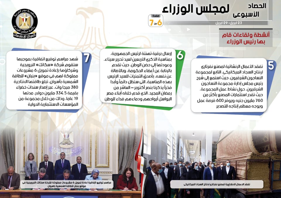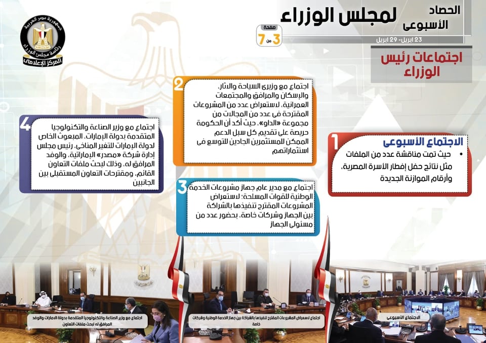 نشر المركز الإعلامي لمجلس الوزراء، تقريرًا شمل إنفوجرافات سلط من خلالها الضوء على الحصاد الأسبوعي لمجلس الوزراء، وذلك خلال الفترة من 23 حتى 29 أبريل 2022، والذي تضمن الموافقة على عدد من القرارات، فضلًا عن الاجتماعات واللقاءات التي عقدها الدكتور مصطفى مدبولي، رئيس مجلس الوزراء، بالإضافة إلى ما قام به من أنشطة.