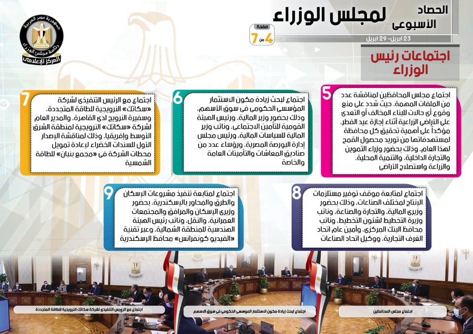 وتضمنت الاجتماعات أيضًا، وفقًا لما أبرزه التقرير، اجتماع مجلس المحافظين لمناقشة عدد من الملفات المهمة، حيث شدد على منع وقوع أي حالات للبناء المخالف أو التعدي على الأراضي الزراعية أثناء إجازة عيد الفطر، مؤكدًا على أهمية تحقيق كل محافظة لمستهدفاتها من توريد محصول القمح لهذا العام، وذلك بحضور وزراء التموين والتجارة الداخلية، والتنمية المحلية، والزراعة واستصلاح الأراضي، بالإضافة إلى الاجتماع الأسبوعي، حيث تمت مناقشة عدد من الملفات مثل نتائج حفل إفطار الأسرة المصرية، وأرقام الموازنة الجديدة، فضلًا عن عقد اجتماع لبحث زيادة مكون الاستثمار المؤسسي الحكومي في سوق الأسهم، وذلك بحضور وزير المالية، ورئيس الهيئة القومية للتأمين الاجتماعي، ونائب وزير المالية للسياسات المالية، ورئيس مجلس إدارة البورصة المصرية، ورؤساء عدد من صناديق المعاشات والتأمينات العامة والخاصة.