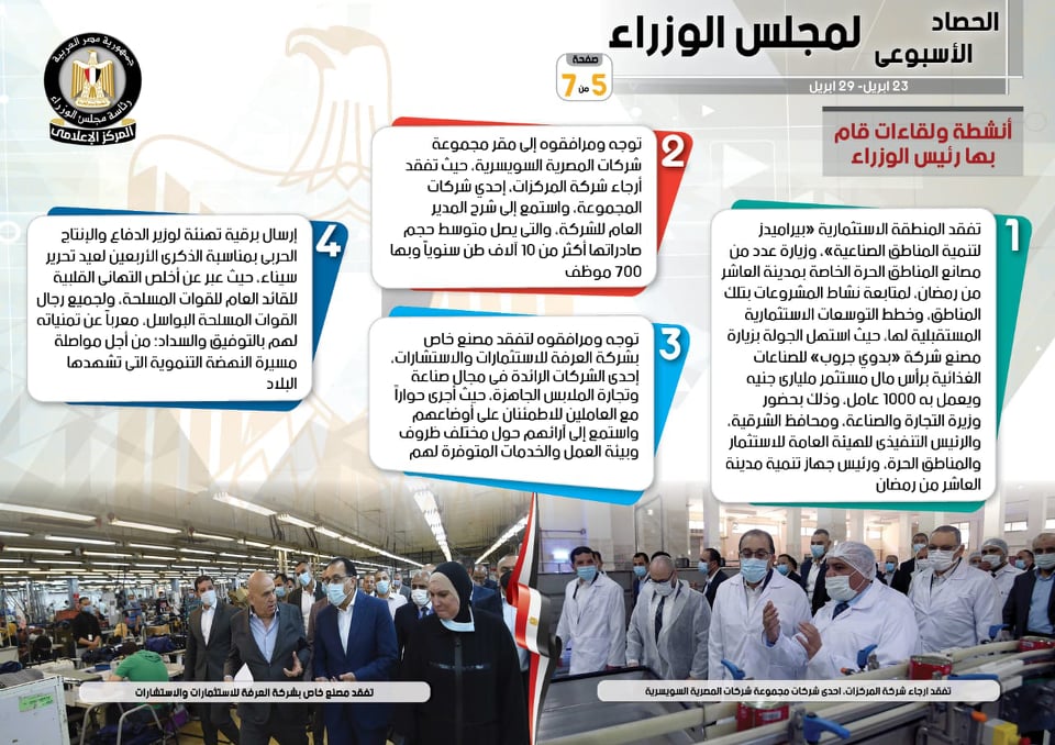 وبشأن الأنشطة التي قام بها رئيس مجلس الوزراء، فبحسب التقرير، شملت تفقد المنطقة الاستثمارية "بيراميدز لتنمية المناطق الصناعية"، وزيارة عدد من مصانع المناطق الحرة الخاصة بمدينة العاشر من رمضان، لمتابعة نشاط المشروعات بتلك المناطق، وخطط التوسعات الاستثمارية المستقبلية لها، حيث استهل الجولة بزيارة مصنع شركة "بدوي جروب" للصناعات الغذائية برأس مال مستثمر ملياري جنيه ويعمل به 1000 عامل، وذلك بحضور وزيرة التجارة والصناعة، ومحافظ الشرقية، والرئيس التنفيذي للهيئة العامة للاستثمار والمناطق الحرة، ورئيس جهاز تنمية مدينة العاشر من رمضان، بالإضافة إلى توجه ومرافقوه إلى مقر مجموعة شركات المصرية السويسرية، حيث تفقد أرجاء شركة المركزات، إحدى شركات المجموعة، واستمع إلى شرح المدير العام للشركة، والتي يصل متوسط حجم صادراتها أكثر من 10 آلاف طن سنويًا وبها 700 موظف، بجانب توجه ومرافقوه لتفقد مصنع خاص بشركة العرفة للاستثمارات والاستشارات، إحدى الشركات الرائدة في مجال صناعة وتجارة الملابس الجاهزة، حيث أجرى حوارًا مع العاملين للاطمئنان على أوضاعهم واستمع إلى آرائهم حول مختلف ظروف وبيئة العمل والخدمات المتوفرة لهم.