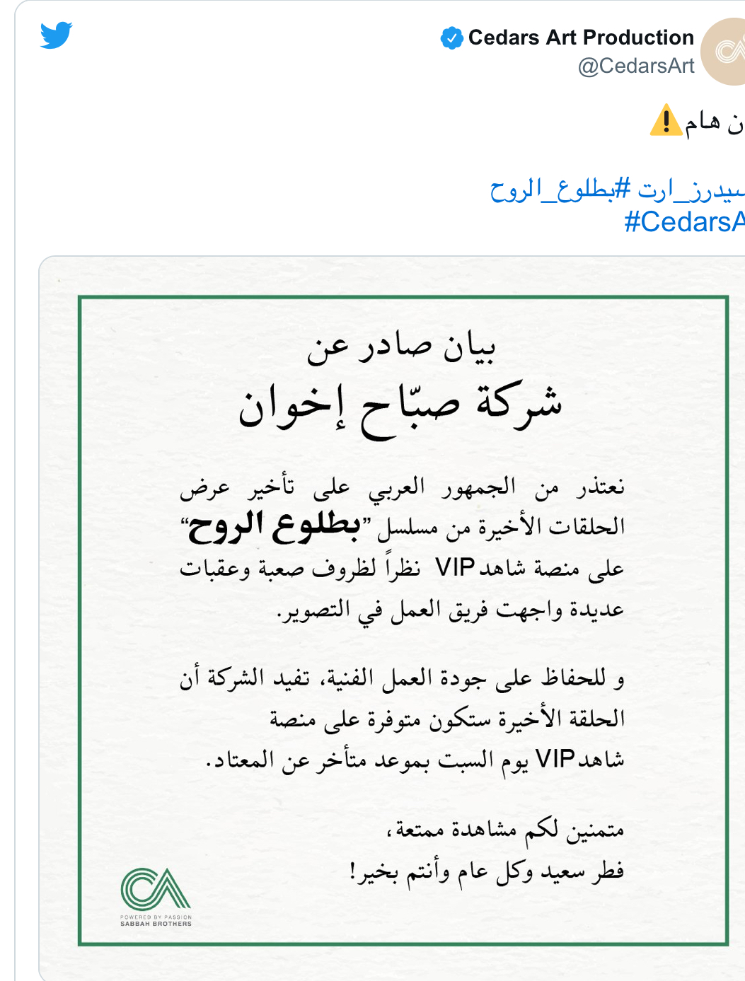 وأضافت الشركة المنتجة في بيانها: ”وللحفاظ على جودة العمل الفنية، تفيد الشركة أن الحلقة الأخيرة ستكون متوفرة على منصة شاهد vip بموعد متأخر عن المعتاد، متمنين لكم مشاهدة ممتعة“.