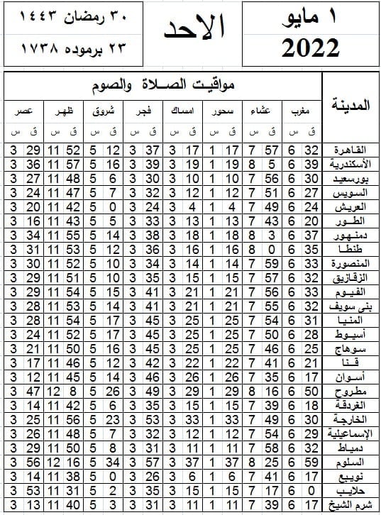 وجاءت مواقيت الصلاة اليوم وفقًا للتوقيت المحلي لمدينتي القاهرة والإسكندرية وعدد من مدن ومحافظات الجمهورية كالتالي: