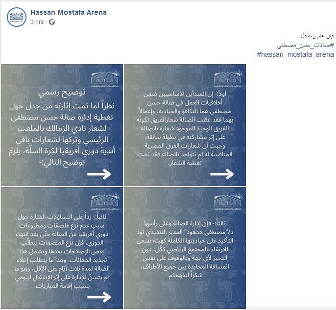 أصدرت هيئة مجمع "صالات حسن مصطفى" بيانًا كشفت فيه سببَ تغطية وطمس شعار الزمالك داخل الصالة المغطاة التي استضافت مباراة نهائي كأس السوبر لكرة اليد بين الأهلي والزمالك، وترك شعار الأندية التي شاركت في بطولة أفريقيا لكرة السلة، وكأس العالم للأندية لكرة السلة.