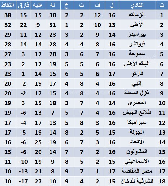 ويتصدر الزمالك جدول ترتيب الدوري المصري الممتاز برصيد 38 نقطة ويليه الأهلي ثانيًا برصيد 32 نقطة بعدد مباريات أقل، ثم بيراميدز ثالثًا برصيد 29 نقطة ويليه فيوتشر رابعًا برصيد 28 نقطة.