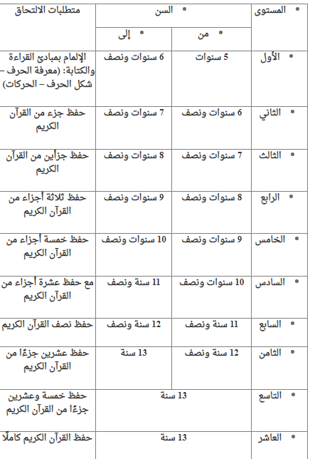 - ألَّا يقل عمر الطفل المتقدم في أي مستوى عن خمس سنوات ولا يزيد على ثلاث عشرة سنة عند التقديم.