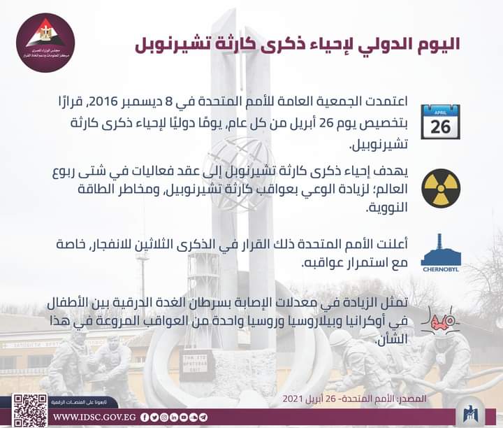 نشر مركز المعلومات ودعم اتخاذ القرار بمجلس الوزراء عبر صفحته الرسمية على موقع التواصل الاجتماعي فيسبوك، إنفوجراف، بشأن اليوم الدولي لإحياء ذكرى كارثة تشيرنوبل.