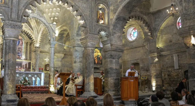 وبرفقة آلة الأورجن، صدحت أصوات المصلين، السبت، في الكنيسة التي اكتظت بهم، وفقا وكالة فرانس برس.
