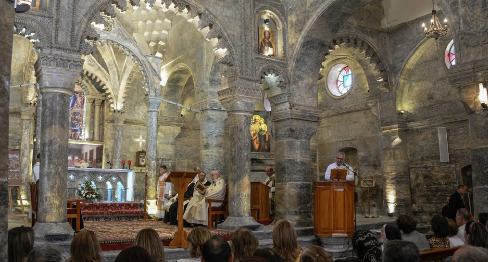 واستعاد مذبح الكنيسة المبني بالرخام الأبيض والرمادي، رونقه السابق، بأعمدته وأقواسه المزخرفة، أما النوافذ الدائرية الصغيرة، فقد زُينت بزجاج ملون جديد؛ وفيما دق جرس الكنيسة، انطلقت «الزغاريد» تعبيرا عن الفرح.