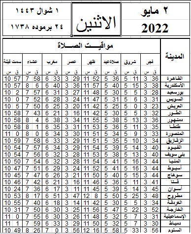 مواقيت الصلاة اليوم الإثنين 2-5-2022 في القاهرة والمحافظات