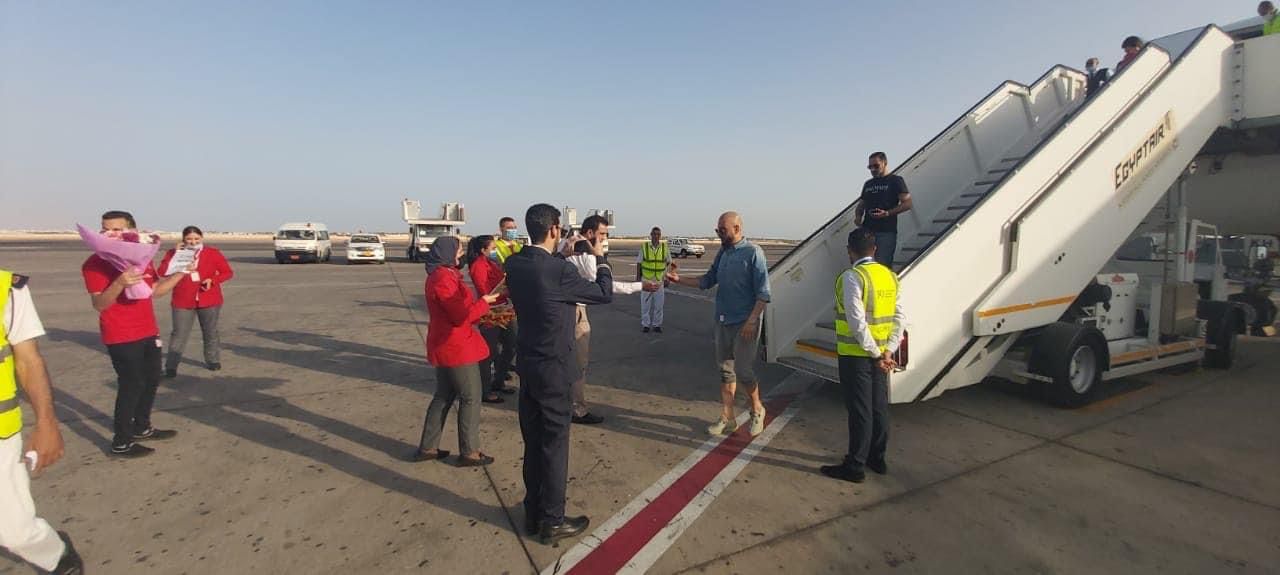 وقالت الشركة المصرية للمطارات: إنه تم استقبال الطائرة بمدافع المياه داخل أرض المهبط، وذلك وفقًا للعرف الدولي في افتتاح خطوط الطيران الجديدة أو استئناف الطيران بعد فترة توقف؛ حيث توقفت الشركة منذ عام ٢٠١٩، وقامت إدارة المطار بالترحيب بركاب الرحلة البالغ عددهم ١٢٢ راكبًا، وتقديم الورود والهدايا التذكارية فور دخولهم صالة الوصول.