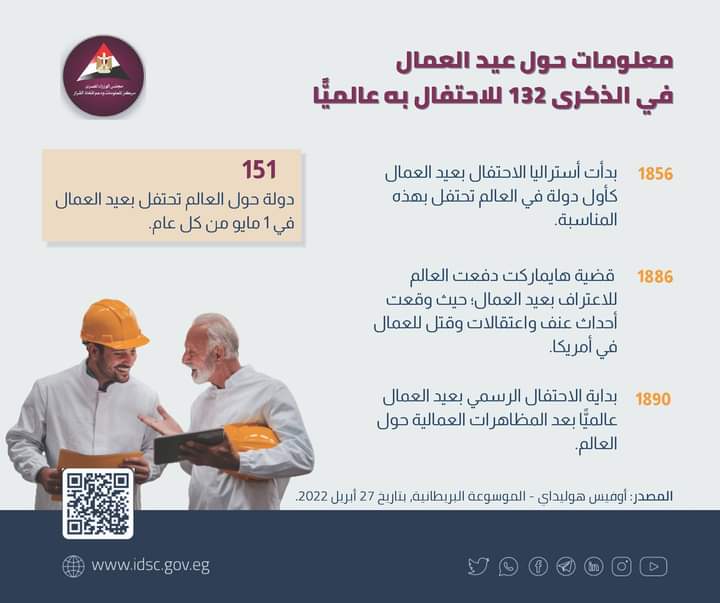 نشر مركز المعلومات ودعم اتخاذ القرار بمجلس الوزراء عبر صفحته الرسمية على موقع التواصل الاجتماعي فيس بوك، إنفوجراف، بشأن الاحتفال بيوم عيد العمال.