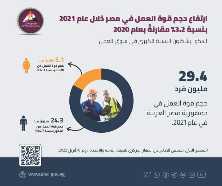 نشر مركز المعلومات ودعم اتخاذ القرار بمجلس الوزراء عبر صفحته الرسمية على موقع التواصل الاجتماعي فيسبوك، إنفوجراف، بشأن حجم قوة العمل في مصر خلال عام 2021.