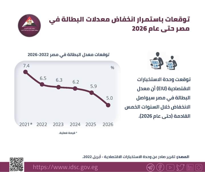 وبالتوازي مع جهود الدولة المصرية تجاه تحقيق الهدف الثامن من أهداف التنمية المستدامة والخاص بتوفير العمل اللائق وخفض معدلات البطالة، جاءت توقعات وحدة الاستخبارات الاقتصادية Economist Intelligence Unit "EIU" إيجابية فيما يخص استمرار انخفاض معدلات البطالة في مصر خلال السنوات الخمس القادمة حتى عام 2026.