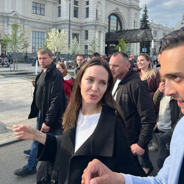 كما ظهرت أنجلينا جولي وهي ترتدي ملابس غير رسمية، وكانت تتحدث مع سكان المنطقة، وعند تجولها سمعت أصوات صافرات الإنذار ما أدي لسيرها بسرعة مع مرافقيها باحثة عن ملجأ للحماية من هجوم صاروخي، في الوقت الذي كانت القوات الروسية تتجمع في شرقي البلاد لشن هجوم جديد.