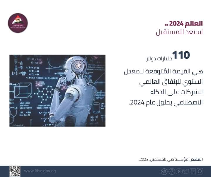 نشر مركز المعلومات ودعم اتخاذ القرار بمجلس الوزراء عبر صفحته الرسمية على موقع التواصل الاجتماعي فيس بوك، إنفوجراف، بشأن الأموال التي ستنفقها شركات الذكاء الاصطناعي علي هذه التكنولوجيا بحلول عام 2024.