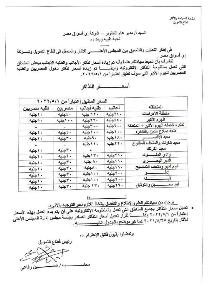 وشملت الزيادة: زيادة تذكرة زيارة ادفو الي 200 جنيه للسائح الأجنبي و100 للطالب الأجنبي و30 جنيه للمصريين و10 جنيه للطلاب المصريين، و200 جنيه لزيارة معبد فيلة و100 جنيه للطلاب المصريين و30 جنيه للمصريين و10 جنيه للطلاب المصريين، وزيادة تذكرة معبد ابوسمبل والتوثيق الي 260 جنيه للسائحين الاجانب و130 جنيه للطلاب الأجانب و30 جنيه للمصريين و10 جنيه للطلاب المصريين.