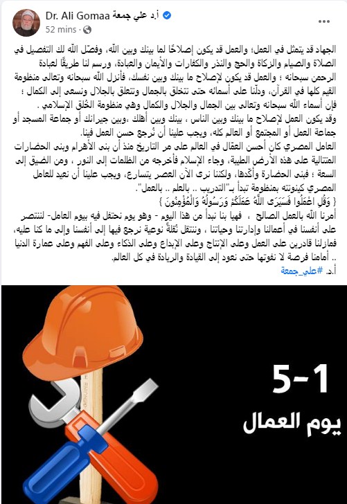 واختتم علي جمعة حديثه قائلًا: { وَقُلِ اعْمَلُوا فَسَيَرَى اللَّهُ عَمَلَكُمْ وَرَسُولُهُ وَالْمُؤْمِنُونَ }.. أمرنا الله بالعمل الصالح، فهيا بنا نبدأ من هذا اليوم- وهو يوم نحتفل فيه بيوم العامل- لننتصر على أنفسنا في أعمالنا وإدارتنا وحياتنا، وننتقل نُقلةً نوعية نرجع فيها إلى أنفسنا وإلى ما كنا عليه، فمازلنا قادرين على العمل وعلى الإنتاج وعلى الإبداع وعلى الذكاء وعلى الفهم وعلى عمارة الدنيا.. أمامنا فرصة لا نفوتها حتى نعود إلى القيادة والريادة في كل العالم."