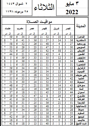 مواقيت الصلاة اليوم الثلاثاء 3-5-2022 في القاهرة والمحافظات