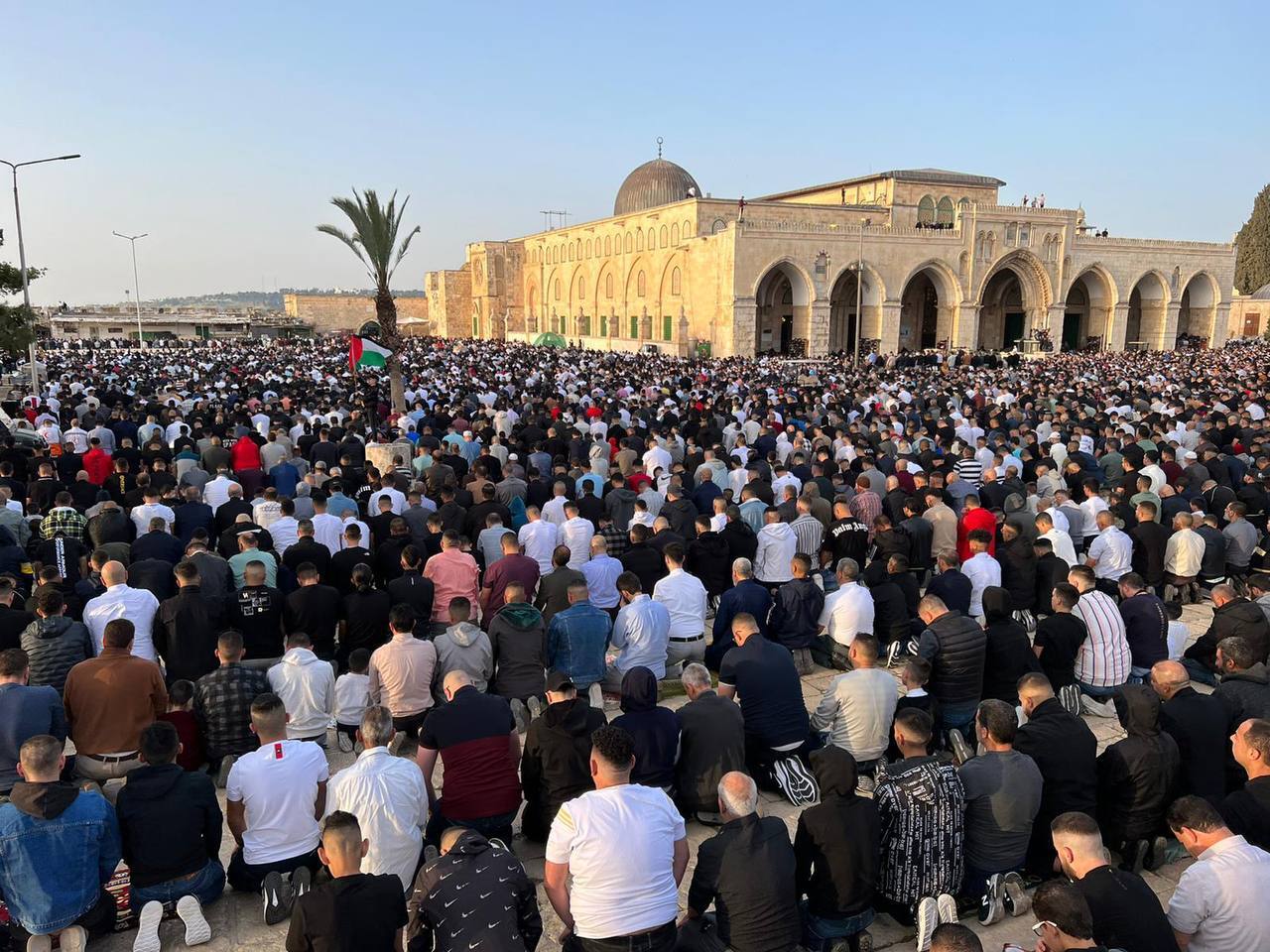 وزين العلم الفلسطيني أجواء العيد في رحاب المسجد، ومع انتهاء الصلاة، توجه المصلون إلى مقبرتي اليوسفية والرحمة في باب الأسباط، لزيارة موتى المسلمين، كما جرت العادة في العيد.