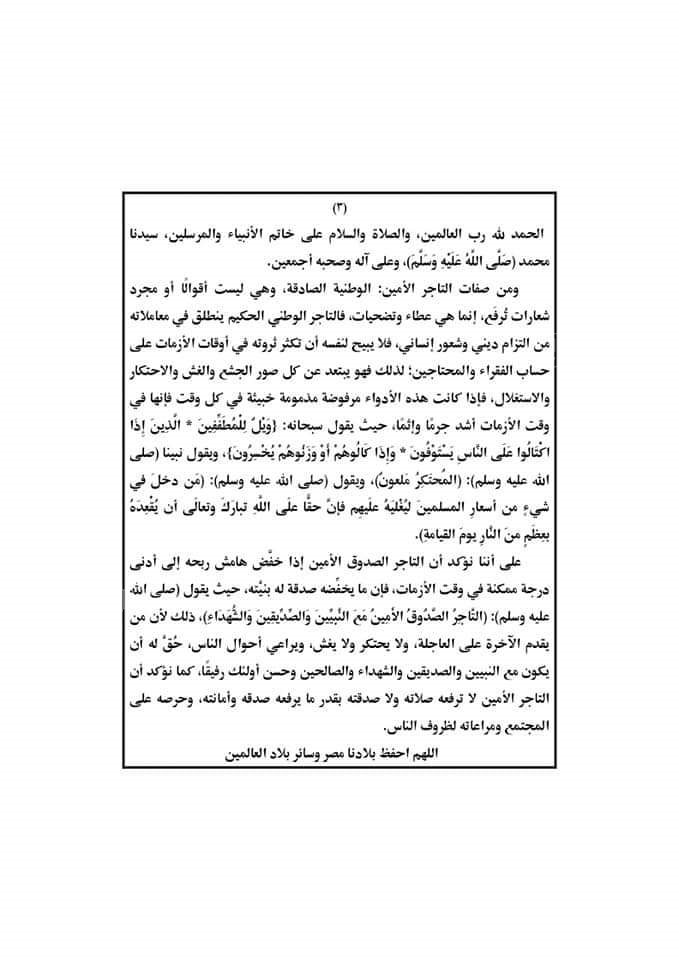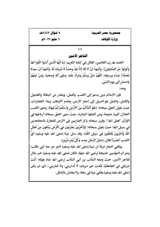 نشرت وزارة الأوقاف موضوع خطبة الجمعة القادمة ٦ مايو ٢٠٢٢م تحت عنوان "التاجر الأمين".