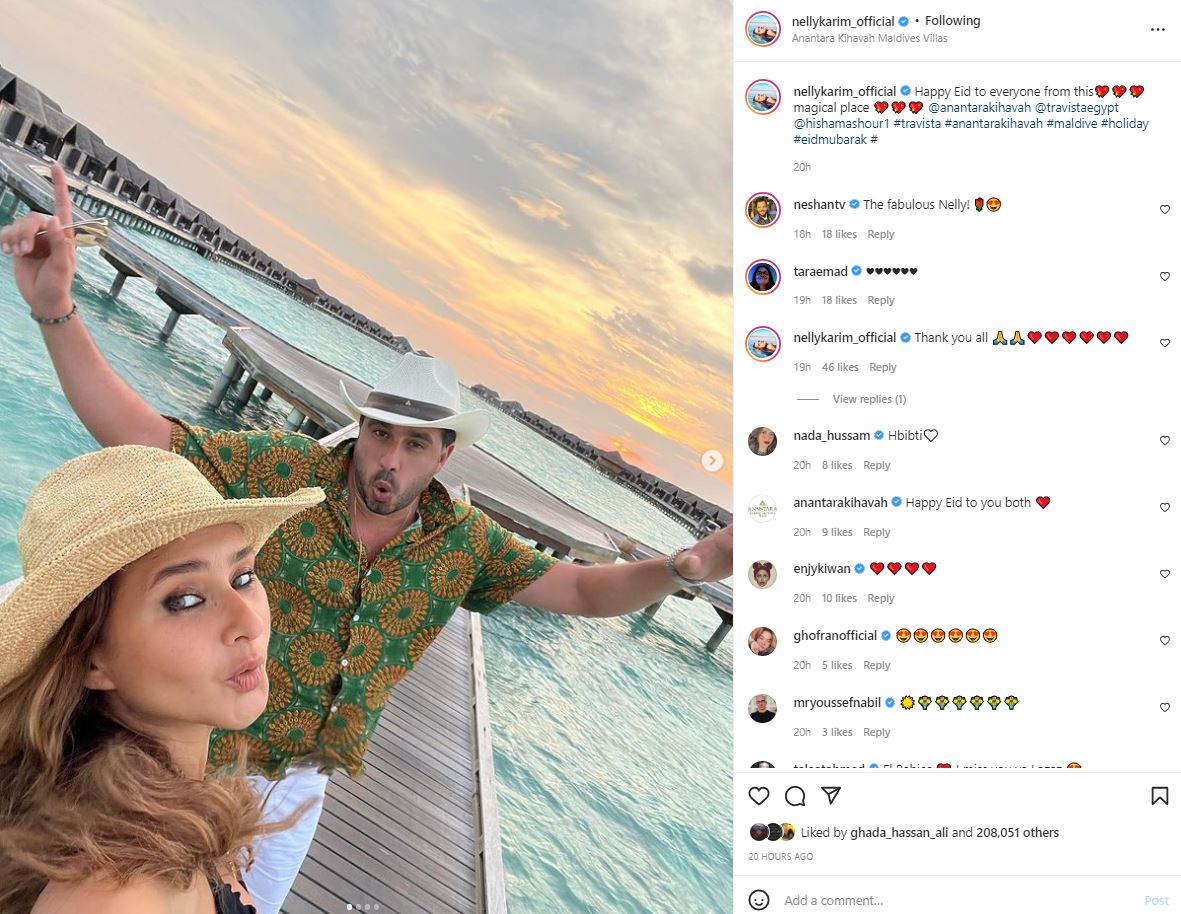 اختارت الفنانة نيللي كريم قضاء إجازة عيد الفطر في جزيرة المالديف بصحبة زوجها هشام عاشور، ونشرت عدة صور لهما عبر حسابها الرسمي على موقع الفيديوهات والصور “إنستجرام”، هنأت خلالها الجمهور بالعيد.