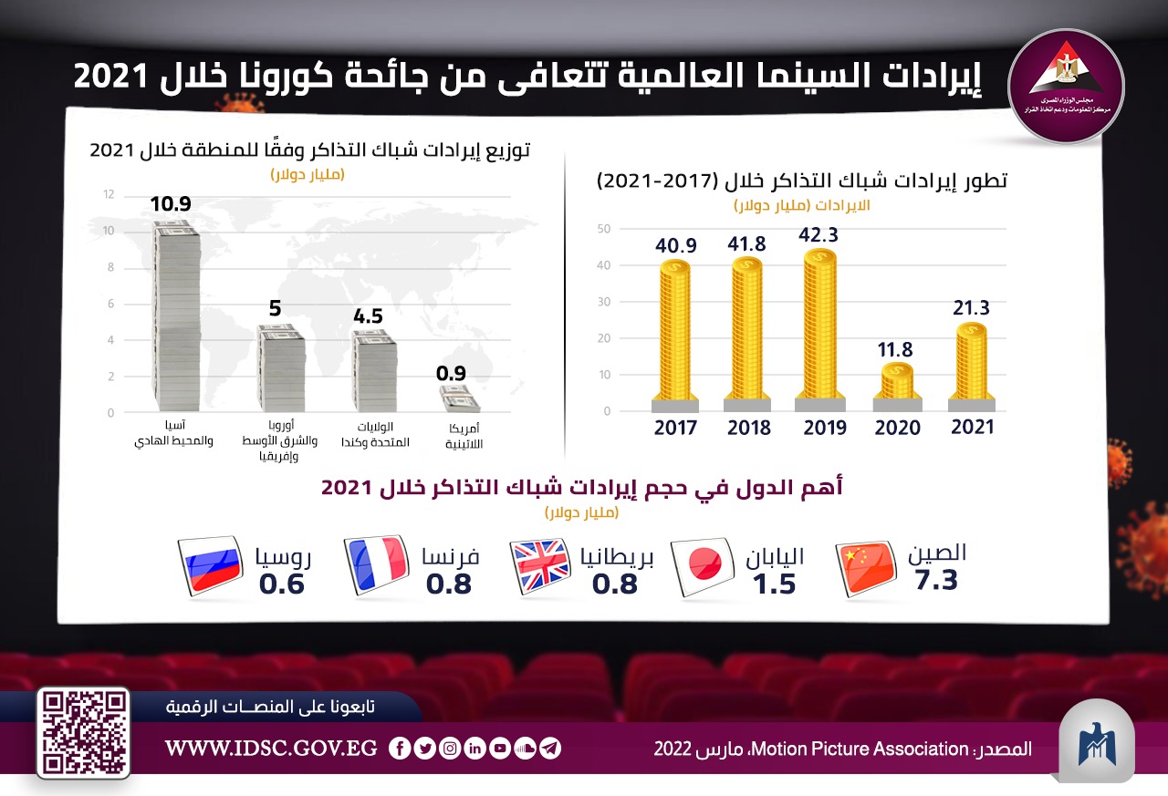 نشر مركز المعلومات ودعم اتخاذ القرار إنفوجراف يتناول تعافي إيرادات السينما العالمية وذلك بعد التراجع الذي أصابها بسبب تداعيات فيروس كورونا.