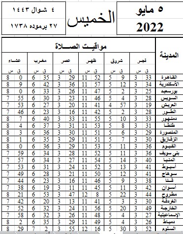 مواقيت الصلاة اليوم الخميس 5- 5 - 2022 في القاهرة والمحافظات